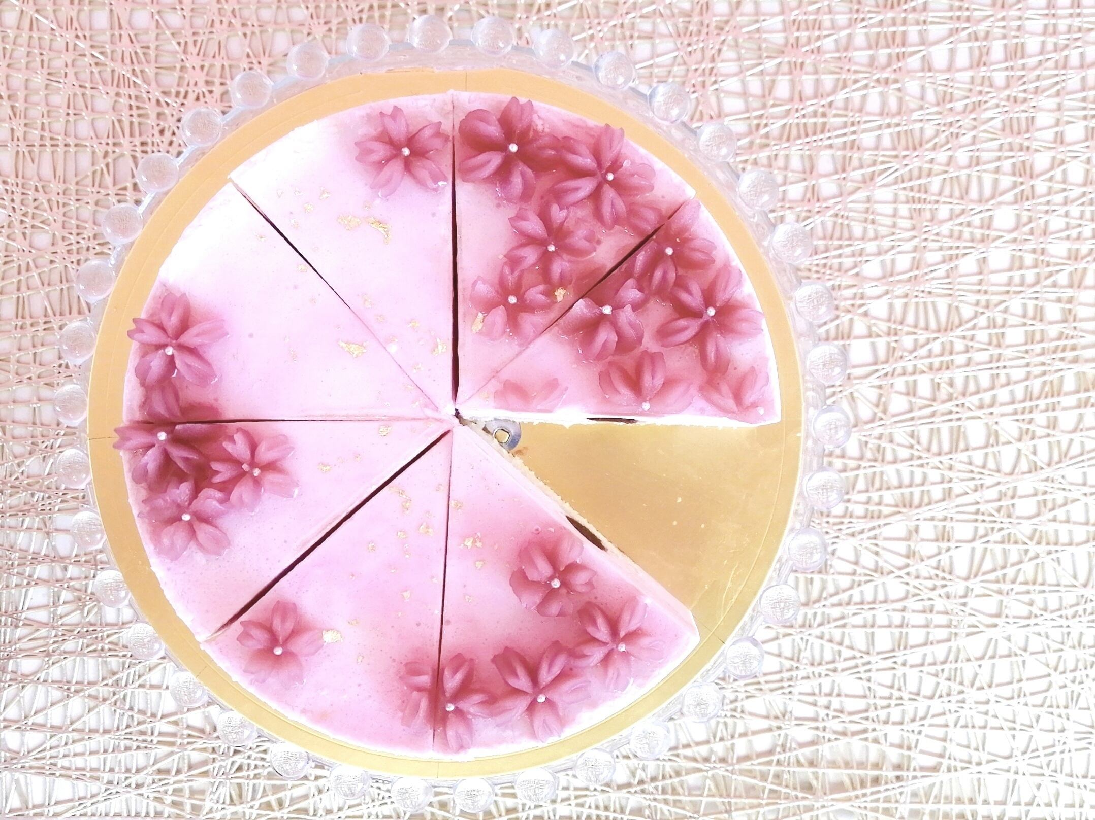 桜あんで絞った桜が一面に咲くムースケーキ。