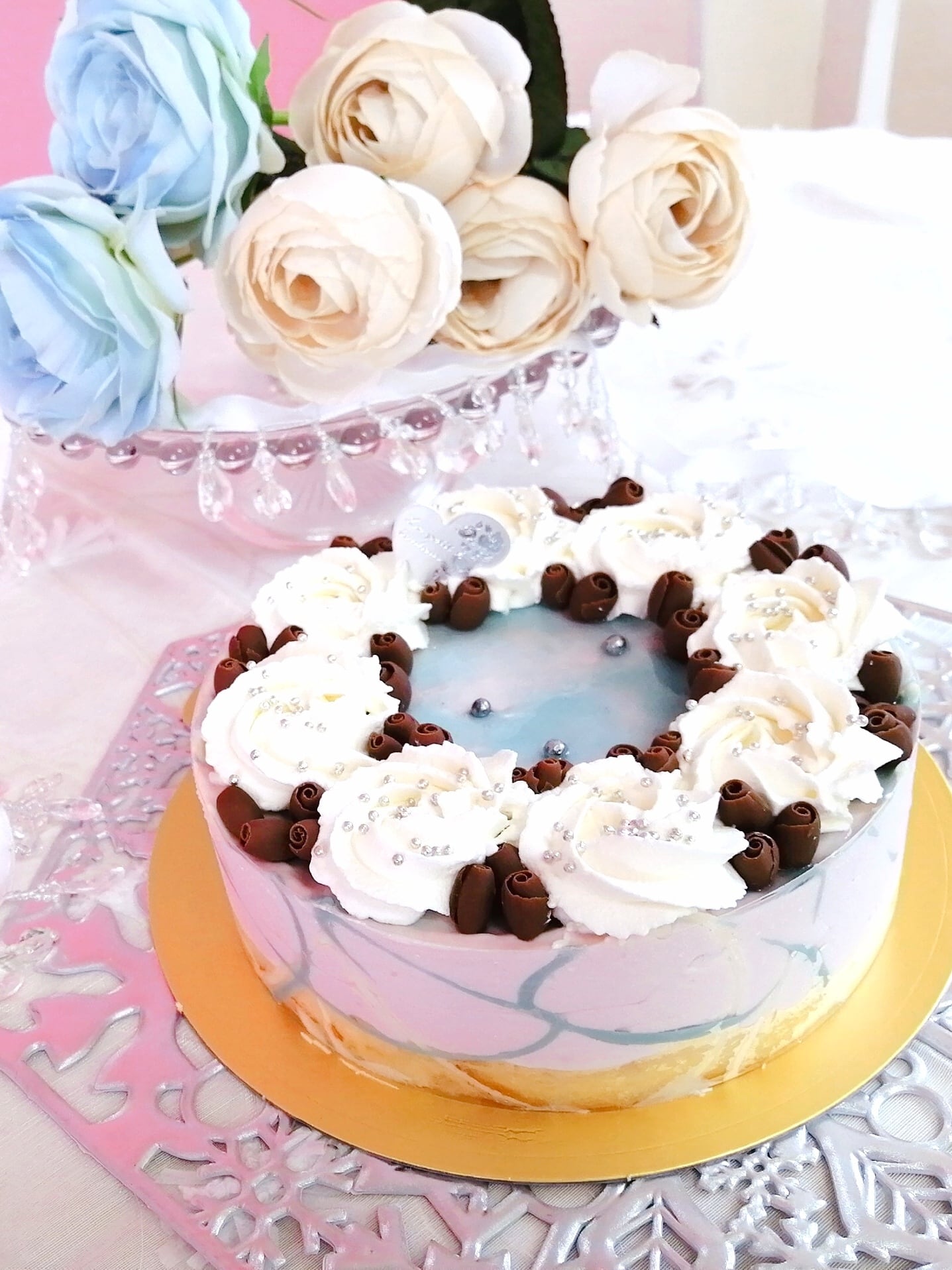 生クリームの薔薇とチョコレートコポーで飾り、アラザンが夏の大三角を描いています。