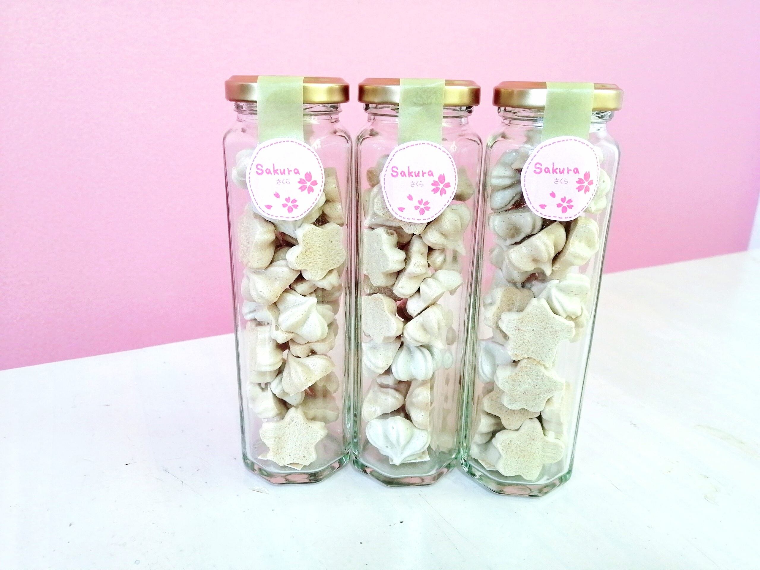 優しい色合いの葉桜風味のメレンゲを。瓶詰めでお届けします。