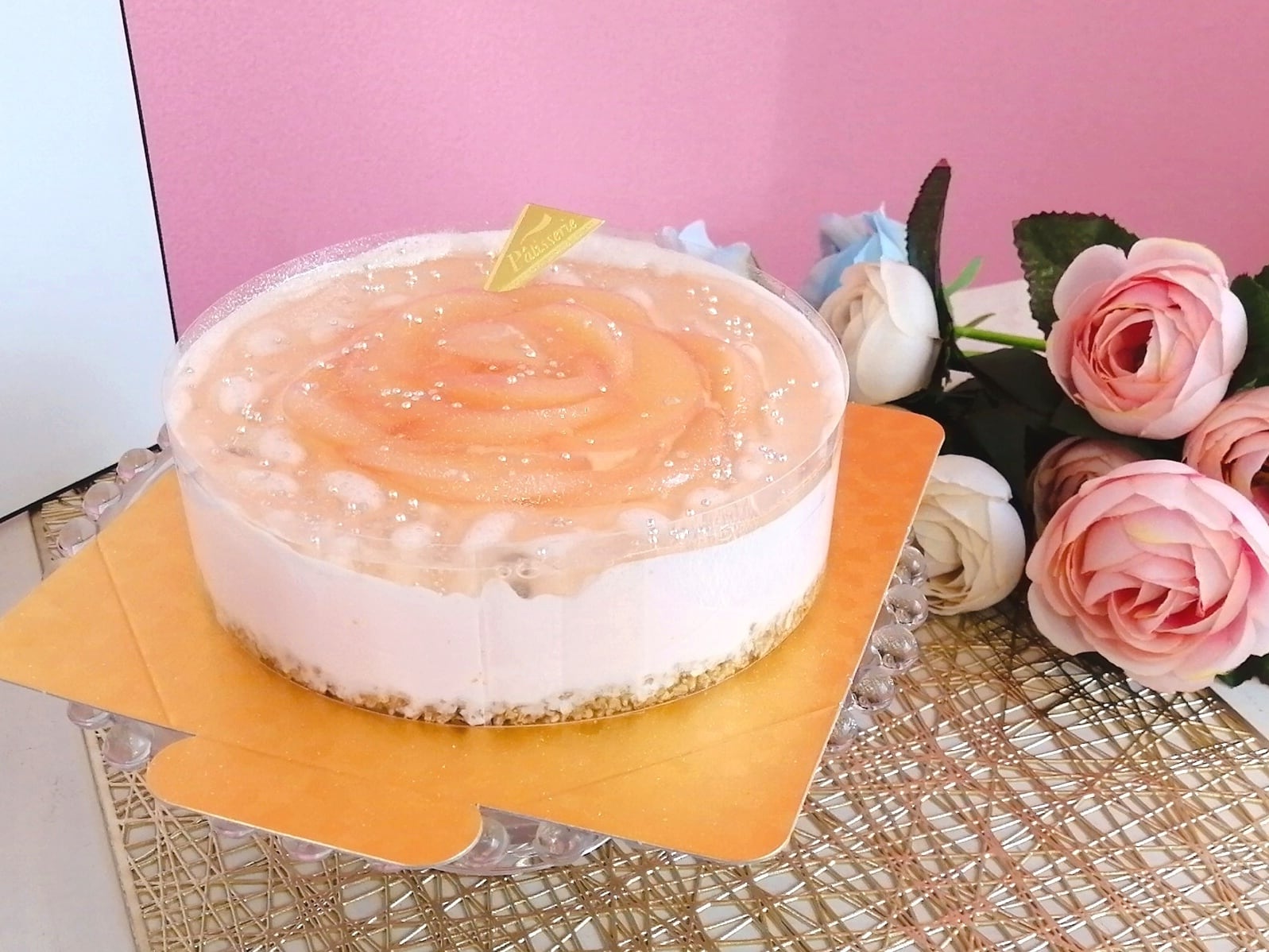 桃の薔薇を閉じ込めたコラーゲンジュレ&爽やかな桃ムースの2層ケーキ。